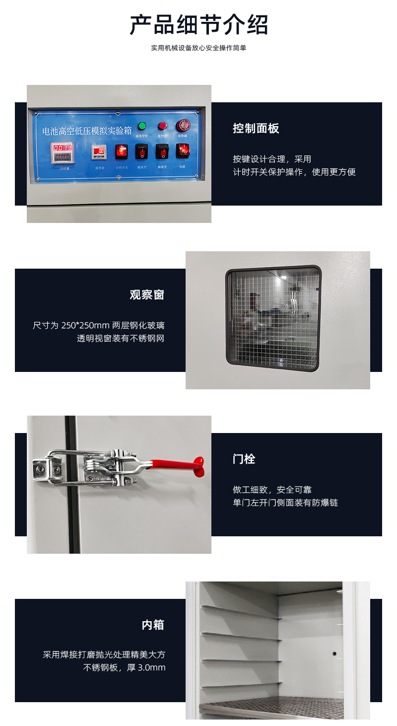 1內(nèi)箱材質(zhì): SUS201# 不銹鋼,厚度3mm; 2、外箱材質(zhì): A3 冷板烤漆, 厚度1.5mm; 3、壓力范圍: 0.5~100Kpa,常用測試氣壓11.6 Kpa; 4、內(nèi)箱尺寸: W400xH400xD400mm 5、外箱尺寸: W550xH1200xD550 6、置物隔板材質(zhì):不銹鋼; 7、真空度顯示:數(shù)顯式真空表控制,準確顯示真空度,易于設(shè)置真空度; 8、計時器: LED數(shù)顯, 在0-9999H內(nèi)自由設(shè)置可(H/M/S秒可切換); 9、 壓力波動:≤5%; 10、 設(shè)備使用電源:AC220V,50HZ,2.2KW; | ||