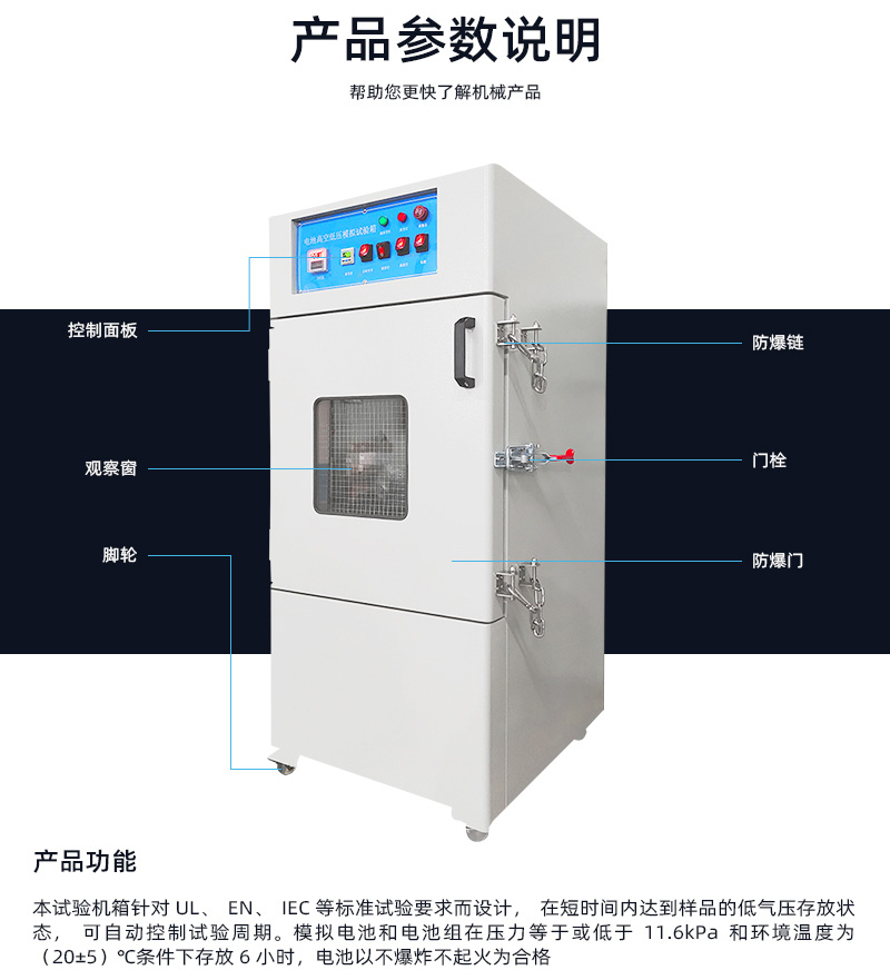 本試驗機箱針對UL、EN、IEC等標(biāo)準試驗要求而設(shè)計,在短時間內(nèi)達到樣品的低氣壓存放狀態(tài),可自動控制試驗周期,全程監(jiān)控箱內(nèi)氣壓變化,實現(xiàn)試驗的自動終止。模擬電池和電池組在壓力等于或低于11.6kPa和環(huán)境溫度為(20±5)℃條件下存放6小時,如果電池?zé)o滲漏,無排氣,無解體,無破裂和無起火,并且每個實驗電池或電池組在試驗后的開路電壓不小于其在進行模擬實驗前的電壓的90%,即為合格。 滿足標(biāo)準:GB/T 31485-2015,GB/T 31241-2014,UN38.3,IEC62133,QC/T743-201X,GB/T 8897.4-2008,GB/T 21966-2008 | ||