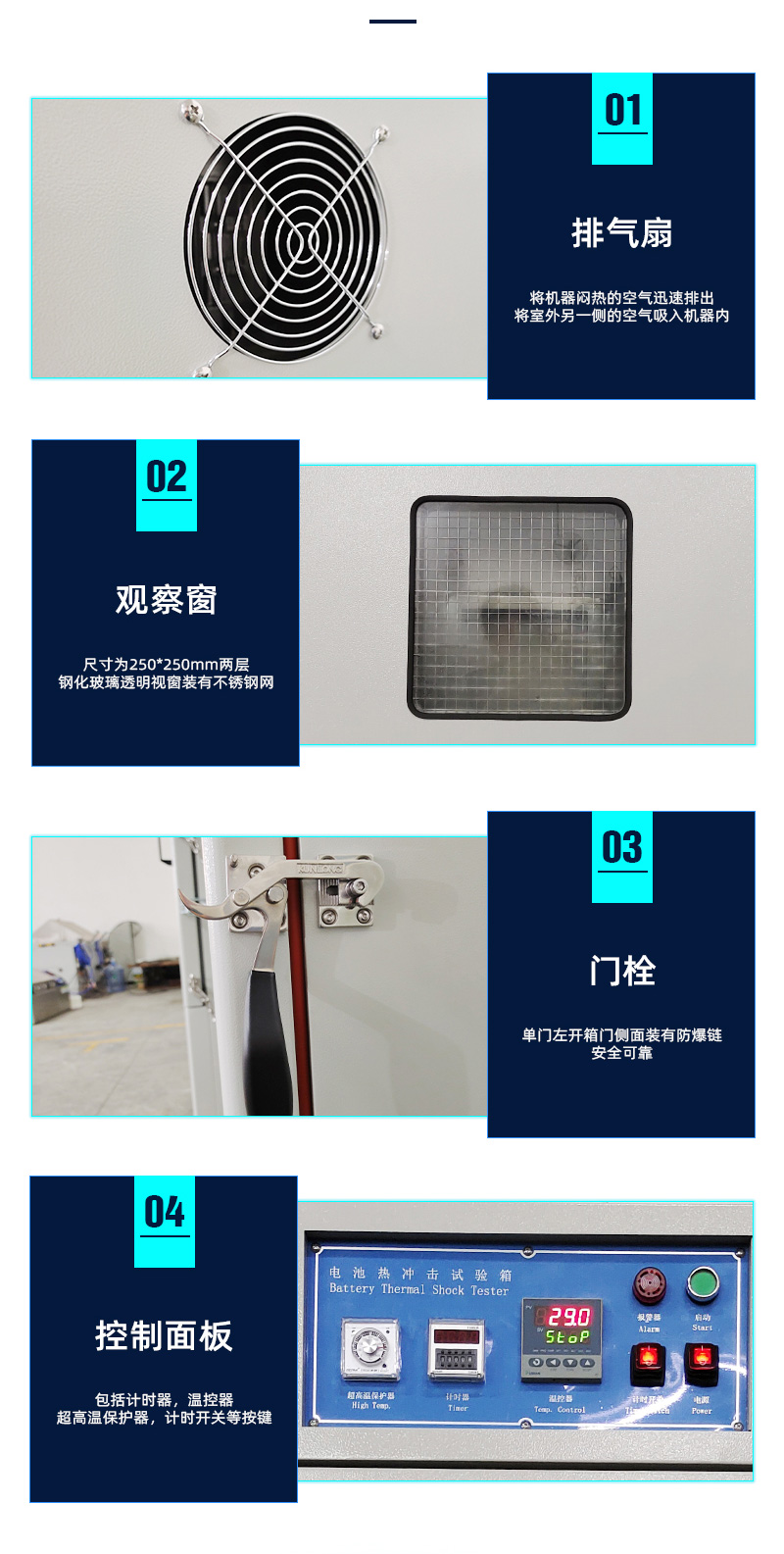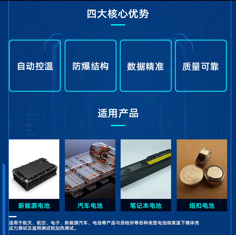 電池熱沖擊試驗箱是模擬電池放置在自然對流或強制通風的高溫箱中,以一定的升溫速率升溫至設定測試溫度并保持一定時間,采用熱風循環系統,可保證工作溫度分布均勻。 適用標準: GB/T 31485-2015,GB/T 31241-2014,UN38.3,IEC62133,QC/T743-201X,GB/T 8897.4-2008,GB/T 21966-2008 | ||