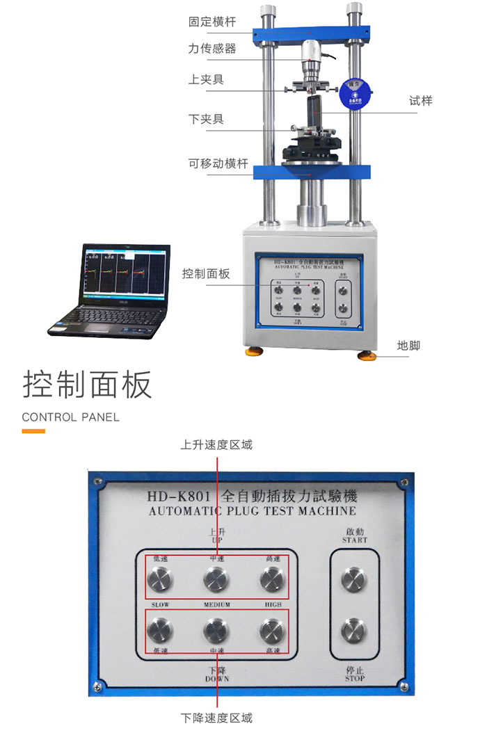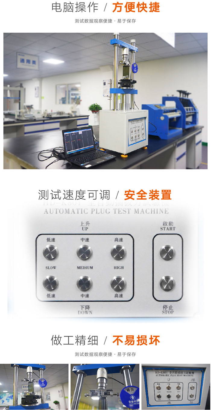 插拔力試驗機適用于各種手機及電腦周邊連接器的插拔力試驗,本機能解決各種連接器測試的夾具問題,及測試時公母連接器能自動對準,不會有吃單邊的問題。 特點 1.可連續做插入力及拔出力值之變化情形;可作連接器插拔壽命試驗。 2.采用伺服系統脈沖控制,控制精度為0.001mm, 3.通過電腦可作一系列的過程控制:插拔行程、速度、次數、暫停時間、插拔力顯示以及繪制位移和插拔曲線圖,報表打印、數據儲存。 4.測試條件皆由計算機畫面設定。 | ||
