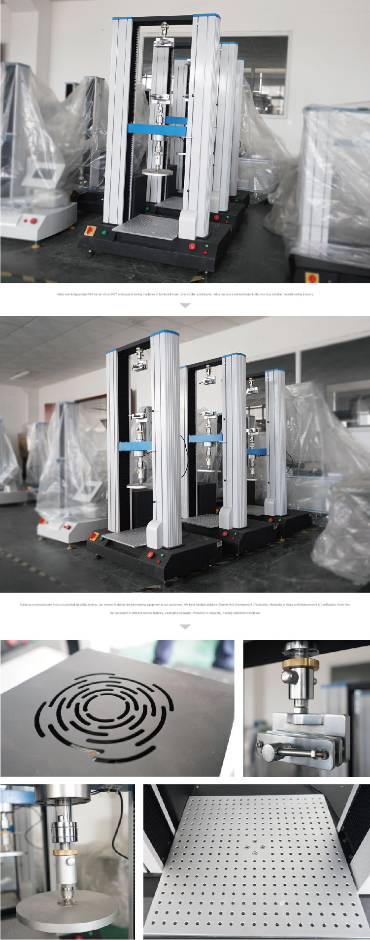 本產品廣泛應用于測試各類五金、金屬、橡塑料、鞋業、皮革、服裝、紡織、絕緣體、電線電纜、端子等材料的拉伸、撕裂、剝離、抗壓、彎曲抗剪力、三點抗折、延伸率,以及對海綿、泡沫等多孔彈性材料的壓縮凹入硬度、壓陷比等各項物性性能的測試。也用于測定海綿、泡沫等多孔彈性材料的壓縮凹入硬度和計算壓陷比 設計標準:GB/10807-2006, ITTC 1.1 硬度測試,ITCC 1.2 壓陷比 ISO2439, ASTM D3574 HG/T 5836-2021 乳膠墊 本標準規定了乳膠墊的要求、試驗方法、檢驗規則和包裝、標志、運輸與貯存。本標準適用于由天然膠乳、合成膠乳或由天然膠乳與合成膠乳并用的混合膠乳加入配合劑經發泡、硫化等工藝制備的乳膠墊芯與墊套組成的乳膠墊 操作原理 壓陷硬度測試:將試樣置于上、下壓盤間,上壓盤以規定速度向下壓縮一定的尺寸,按標準要求的A法(B法、C法)進行測試,荷重元將感應到的壓力反饋給電腦處理,通過電腦測試界面查看數據結果,從而測得海綿、泡沫等試樣等材料的壓陷硬度。 拉伸測試:沿試樣縱向主軸方向恒速拉伸,直到試樣斷裂或其應力(負荷)或應變(伸長)達到某一預定值,測量在這一過程中試驗承受的負荷及其伸長量。 | ||