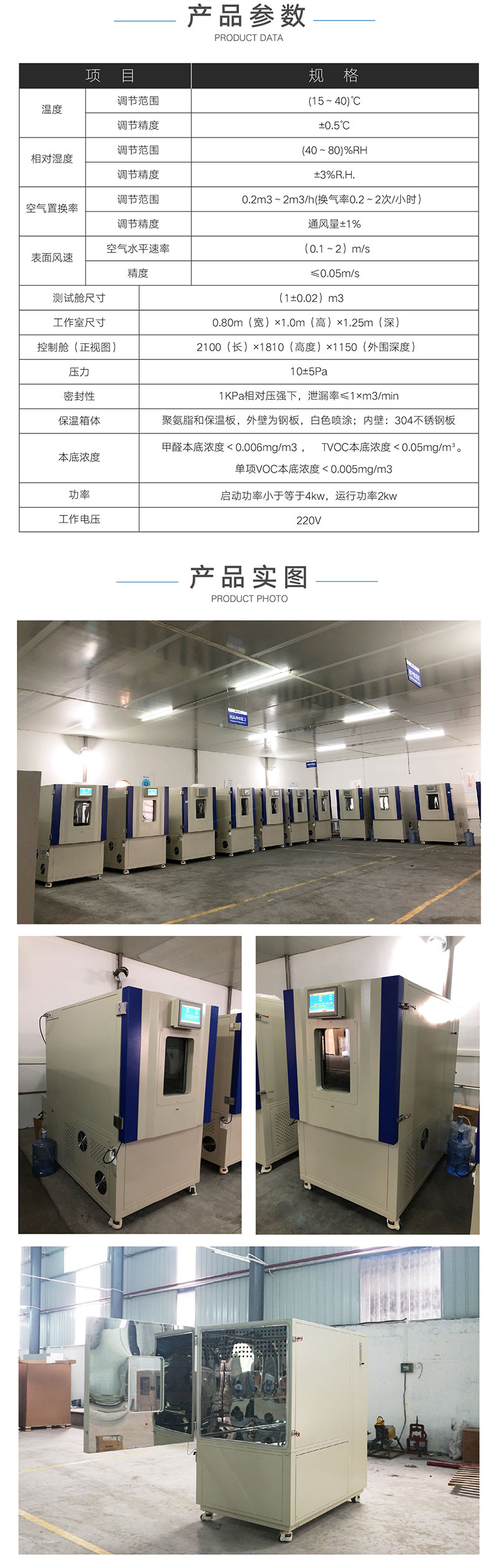 1.箱內(nèi)容積:(1.0±0.02)m³; 2.測試艙箱內(nèi)溫度可調(diào)范圍:(10—40)℃,精度:±0.5℃,分辨率0.1℃,連續(xù)可調(diào); 3.箱內(nèi)相對濕度可調(diào)范圍:(30—80)%,精度:±3%,分辨率0.1%,連續(xù)可調(diào); 4.箱內(nèi)空氣流速:(0.1—2)m/s,精度:±0.05 m/s,連續(xù)可調(diào); 5.空氣置換率:(0.2—2)m³/h,精度:±5%,連續(xù)可調(diào); 6.密封性:當有1000Pa的過壓時,氣體泄漏少于10-3×1m³/min,進出口氣體流量差小于1%; 7.測試艙內(nèi)本底濃度:甲醛≤0.006mg/m³; 8.絕熱性:氣候箱壁及門應具有有效的熱絕緣; 9.噪音:氣候箱工作時的噪聲值不大于60dB; 10.連續(xù)工作時間:氣候箱連續(xù)工作時間不小于40 天; 11.監(jiān)測參數(shù):監(jiān)測顯示艙內(nèi)的溫濕度、送排風量、開關(guān)機時間、工作時間,數(shù)據(jù)可轉(zhuǎn)移存儲; 12.控濕方法:采用露點控濕法,來控制工作艙相對濕度,濕度穩(wěn)定,波動幅度<3%.rh.并且不會在艙壁產(chǎn)生水珠; 13.外形尺寸:1630 x 1200 x 1806mm (長x寬x高); 配置清單 1.標配:主機一臺,抽樣管、吸收瓶、氣體采樣器; 2.選配:分光光度計,水浴鍋,藥劑,玻璃儀器,標準溶液,天平; | ||