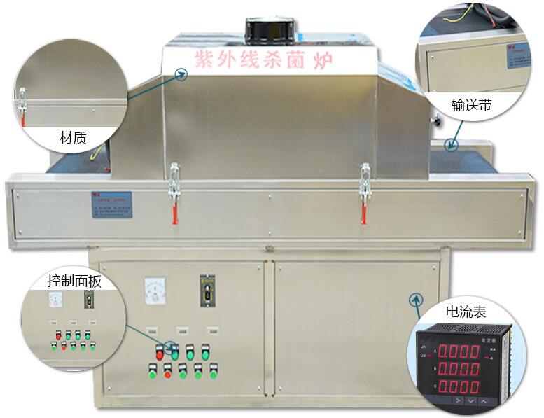 1.工作區隧道外體:1.2mm不銹鋼一套 2.工作區隧道內腔:1.0mm不銹鋼板一套 3.機體支撐架:方通鋼一套型號:2″方通 4.運風系統:強制運風組合抽風機一套(抽出有害氣體) 5.輸送帶:鐵氟龍 6.運輸馬達:800W(變頻器調速) 7.調速器:40W 8.抽風機:CY-125型 9.電流表:50A一套 10.電壓表:220V一套 11.工作電壓:200V--220V(±5)三線制50Hz 紫外線光源有效輻射 燈管長度600mm UV紫外線殺菌燈管16支*20W紫外線燈居內腔縱向,上、下安裝波長253.7nm,1米距離射強度為160微瓦/平方厘米以上。使用壽命為8000小時以上。 其他產品參數: 1.設備全長:2000mm 2.工作區域:1000mm 3.進料作業區域:500mm出料作業區域:500mm 4.出入口高度:180mm 5.輸送帶寬度:500mm 6.輸送帶距地面:750±20mm |