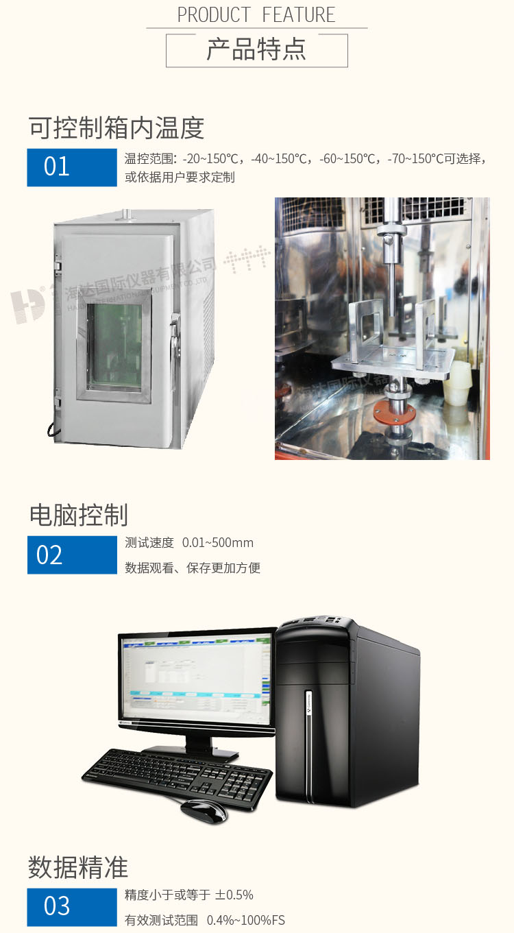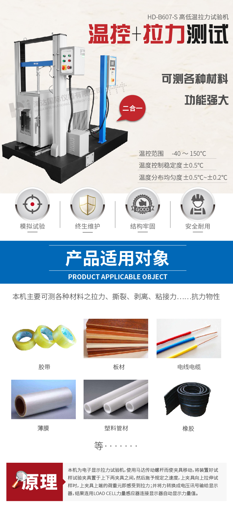 高低溫拉力試驗機HD-B607-S適用于橡膠,塑料異型材,塑料管材、板材、片材,薄膜、電線電纜、防水卷材、金屬絲等材料在高溫或低溫環(huán)境下進行拉伸測試。 設計標準:GB/T 16491、GB/T 1040、GB/T 8808、ASTM D6644、ASTM D5035、ASTM D2061、QB/T 2171、JIS K6854 | ||