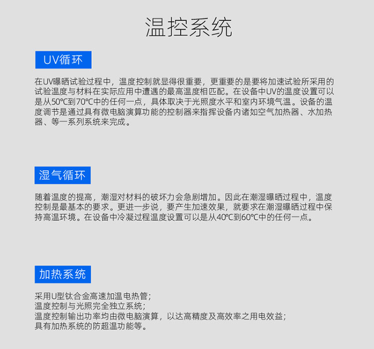 UV紫外老化試驗箱(箱體式)廣泛應用于涂料油墨油漆、樹脂、塑料、印刷包裝、鋁型材、粘合劑、汽車摩托車工業、化妝品、金屬、電子、電鍍、醫藥等。 可以模擬由陽光、雨水和露水對材料造成的危害,UV利用瑩光紫外(UV)燈模擬陽光照射的效果,利用冷擬濕氣雨水和露水。被測試材料放 置于一定溫度下的光照和潮氣交替的循環程序中進行測試。UV用數天或數周的測試,即可重現戶外數月至數年出現的危害。危害類型包括:褪色、變色、失光、 粉化、裂痕、渾濁、泡化、脆化、強度衰退和氧化。 設計標準:ISO 4892-1, ISO 4892-3, ASTM G154, ASTM D1148 | ||