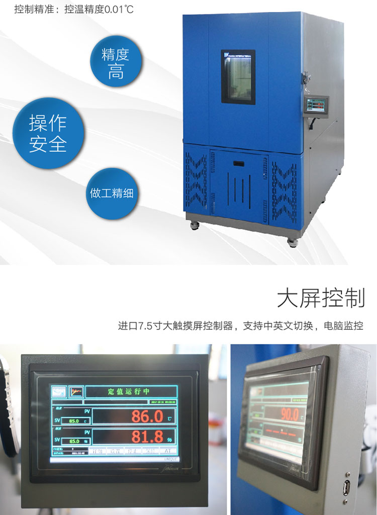 1、整個箱體采用整體結構。箱體結構 2、箱體內側采用1.0mm進口SUS304B不銹鋼板,外側采用1.0mm 冷軋鋼板噴塑,保溫材料采用超細玻璃保溫棉。 3、大門密封采用雙層硅橡膠密封材料。 4、觀察窗為多層導電膜鋼化中空玻璃,尺寸大小為350×500mm為防止低溫時玻璃結霜,特設內置式特制電壓發熱絲環繞加熱帶供電電壓36V,并設有照明燈,為觀察提供照明。 5、在箱體側面設有帶塞子的φ50mm測試孔,塞子材料為硅橡膠低發泡,能耐高低溫,兼具保溫效能。 6、在箱體工作室后側設置有一個空氣調節柜,在其間安裝 加濕器、蒸發器、電加熱器、風機、風機蝸殼等設備。 7、溫度傳感器置于出風口。 8、試驗箱內的送風方式為上送風下回風方式制冷系統 1、溫度快速變化試驗箱制冷系統及壓縮機:為了保證試驗箱降溫速率和較低溫度的要求,本試驗箱采用一套泰康全封閉壓縮機所組成的二元復疊式風冷制冷系統。復疊式制冷系統包含一個高溫制冷循環和一個低溫制冷循環,其連接容器為蒸發冷凝器,蒸發冷凝器是也到能量傳遞的作用,將工作室內熱能通過兩級制冷系統傳遞出去,實現隆溫的目的。制冷系統的設計應用能量調節技術,一種行之有效的處理方式既能保證在制冷機組正常運行的情況下又能對制冷系統的能耗及制冷量進行有效的調節,使制冷系統的運行費用和故障率下降到較為經濟的狀態。 2、制冷劑:R404(高溫循環)、R23(低溫循環) 3、輔助件:膨脹閥(丹麥丹佛斯),電磁閥(意大利CASTEL); 4、過濾器(美國愛高);油離器(臺灣冠壓)等制冷配件均采用進口件。 | ||