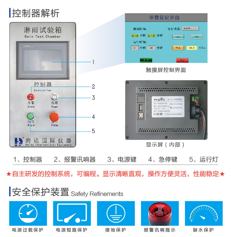 1、內(nèi)尺寸:1960*1960*1900mm (可按客戶要求定制)2、外尺寸:1960*1960*2250mm3、噴水環(huán)半徑:375或500mm4、水管直徑:φ16mm5、噴孔直徑:φ0.4mm6、孔徑間距:50mm7、擺管押幅: ±45°、±60°、±90°、±180°(理論數(shù)值)8、電壓:110V,60HZ9、試驗(yàn)臺(tái)轉(zhuǎn)速 :1r/min也可為無(wú)節(jié)調(diào)速(選配)10、控制器:進(jìn)口調(diào)頻式變頻器11、時(shí)間控制器:進(jìn)口可編程時(shí)間電腦集成控制器12、水壓控制:流量計(jì)13、觀察面:大面積可視化鋼化玻璃門14、供水系統(tǒng):儲(chǔ)水箱、增壓泵15、保護(hù)裝置:漏電、短路、電機(jī)過(guò)熱 | ||