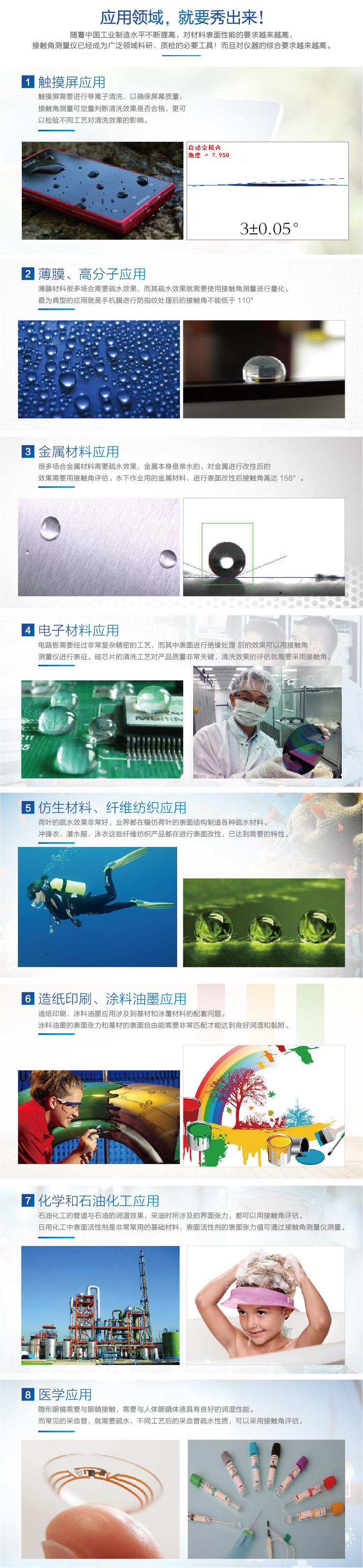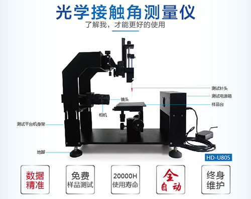 水滴角測試儀用于測試液體對固體的接觸角,即通過測量液體與固體間所形成接觸角的大小,判斷液體對固體的浸潤性。廣泛應用于硅晶、液晶、玻璃、纖維、合成材料、油墨、涂料、農藥等領域的測試與研究。 |