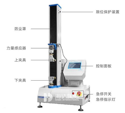 通常稱上限行程為上下夾具之間的距離(試驗行程)+上夾具高度+下夾具高度+傳感器高度。因不同試驗材料會選擇不同的夾具,所以選擇好了夾具才能知道具體試驗行程。材料的不同變形需要不同的試驗行程。如果材料變形600mm,應考慮750mm-800mm的試驗行程,由于測試不同的材料,應根據不同的測試標準,不同的測試標準需要不同的標距。
