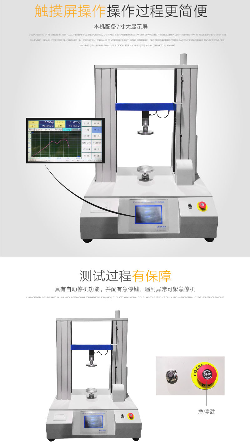 4.3環壓用于厚度在1mm以下之瓦楞芯紙及牛皮紙等。試樣152X12.7mm置于環狀之容器內,以本機檢驗其直立方向之耐壓強度。 4.4邊壓用于厚度在8mm以下之瓦楞紙,試樣100mm乘以25mm置于100mm乘以100mm壓板下用兩塊導塊固定,以本機檢驗其直立方向之豎壓強度。 4.5配合各種附件使用,并可測試紙板之膠合強度及平壓強度。 | ||