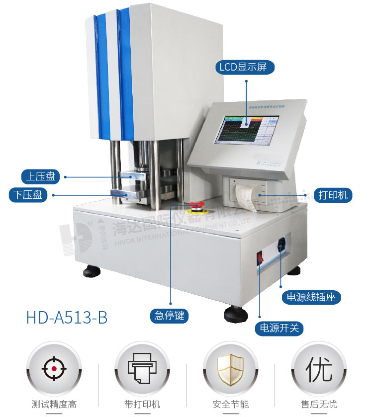 微電腦環壓/邊壓強度試驗機HD-A513-B系列可配合多種材料做全方位之測試,在紙張包裝材料方面,進行多種紙張品質測試,即環壓(RCT)、平壓(FCT)、邊壓(ECT)、粘合(PAT)及一般抗壓(CMT)等5種測試,是結合多項功能于一身的測試設備。