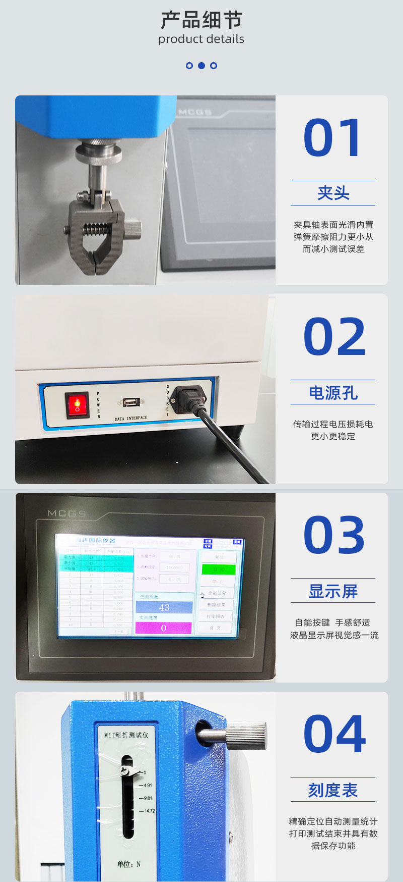 產品特點 1.微電腦控制技術開放式結構,自動化程度高,可同時進行采樣、測控及顯示,功能全面; 2.全自動測量智能判斷,準確快速,操作簡單,測試完畢,開機和做完實驗之后自動找零回位; 3.準確定位,自動測量、統計、打印測試結果,并具有數據保存功能; 4.中文圖形菜單顯示操作界面,高速微型打印機以及觸摸屏設計,使用簡單便捷; 5.光機電一體化現代設計理念,結構緊湊,美觀大方,性能穩定,質量可靠; 技術參數 試驗荷重:4.91N,9.81N,14.72N 彎折角度:135°±2° 試樣大小:試樣大小 折迭速度:(175±10)r/min 折迭頭的寬度:19±1mm 折口的圓弧半徑:0.38±0.02mm 折迭頭夾縫的距離:max1.0mm 計數器:0~9999次 外型尺寸:(L*W*H)400*350*830mm 控制方式:PLC控制觸摸屏操作 重量:約40kg 電源:1∮ ,AC220V,2.6A |