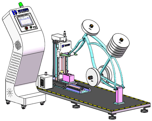 本機用于模擬自行車在騎行時前輪遇到障礙物時可承受地面障礙物沖擊的能力,在進行沖擊試驗后觀察車架前叉組合件的變形量的大小及支架是否出現裂紋,從而判斷產品合格與否。